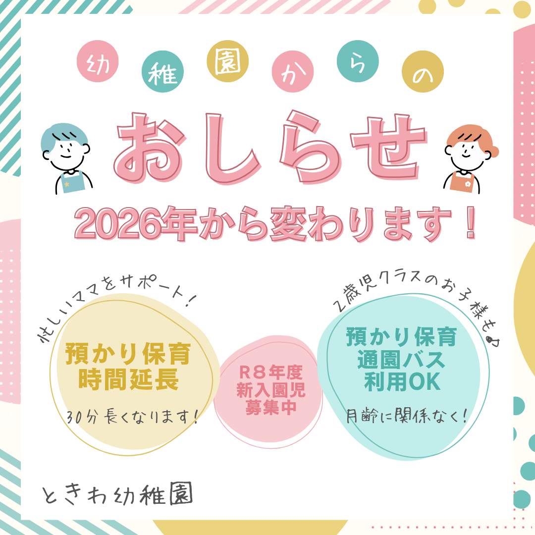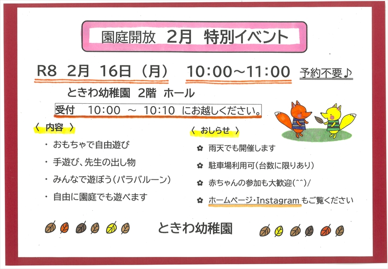 2026. 2. 9 未就園児対象の園庭開放情報(お知らせ掲示板)を更新しました。